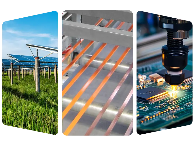 • Photovoltaic စက်ကွင်း- လျှပ်စစ်ဓာတ်အားကို ထိရောက်စွာလုပ်ဆောင်နိုင်ရန် အစိတ်အပိုင်းများကို ကူညီပေးရန်အတွက် photovoltaic ဂဟေဖဲကြိုးများနှင့် busbar များ အစုလိုက်အပြုံလိုက် ထုတ်လုပ်မှု။